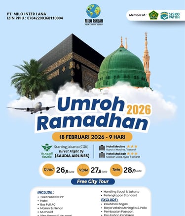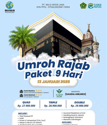 Nikmati pengalaman umroh terbaik dengan Paket kami. Dapatkan fasilitas juga akomodasi yang nyaman, dan layanan istimewa selama perjalanan. Paket ini dirancang untuk memberikan kenyamanan dan kemudahan bagi Anda dan keluarga dalam menunaikan ibadah umroh.